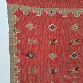 Tessuto in lana di origine berbera, risalente agli anni '60. Tessuto a mano la sua texture è impreziosita da audaci motivi geometrici. Tessuto in tonalità naturali e terrose con delicati tocchi di colore, riflette l'arte senza tempo dell'artigianato berbero. Ideale come arazzo, plaid o tappeto. Ottime condizioni.