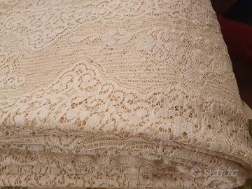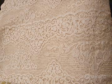 Tessuto in pizzo (poliestere al 70%) metri 13x2 circa, per tende, tovaglie e/o copriletti. Colore beige. Peso totale (ai fini della spedizione) circa 3 kg. Mai usato. Ottime condizioni, sempre ben conservato.