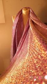 Tessuto di maglina lurex, mano morbida e peso leggero, elasticizzata leggermente solo un verso. La base è un viola chiaro e oro con paillettes termosaldate colore magenta.