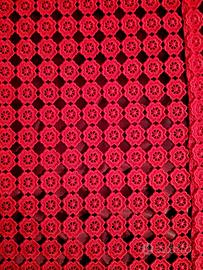 Rotolo di tessuto macramè rosso. Lunghezza 12,5 metri; Larghezza 1,20 m; per un totale di oltre 14 metri quadri. Il tessuto macramè può essere tagliato perfettamente dritto solo con le forbici e non necessita di orli o cuciture poiché non sflilaccia. Perfetto per tende, copriletti, tovaglie, centrini, vestiti, camicette e bordature. Valore della stoffa 350 euro, vendo in blocco a 250.