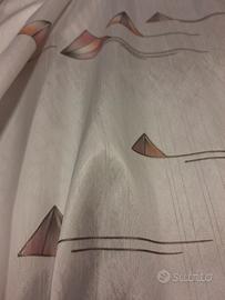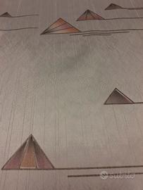 tessuto per tende in poliestere su fondo bianco leggermente lucido e con leggerissima riga dello stesso colore sono disegnate varie piramide di vario colore e dimensioni.