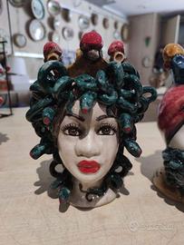 Splendide testa di Medusa e Polifemo in ceramica di Caltagirone realizzata e decorata minuziosamente a mano dai nostri maestri artigiani.