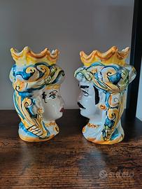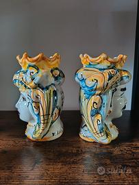 Coppia Testa di Moro Siciliana 14cm - Ceramica di Caltagirone Artigianale Realizzata e decorata interamente a mano a Caltagirone Altezza: 14 cm Ideale come soprammobile, regalo o bomboniera Possibilità di forniture multiple. Ogni testa di moro è un pezzo unico, simbolo di tradizione e arte siciliana.