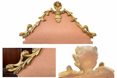 Testata da letto matrimoniale con fregi dorati settecentesca in legno intagliato a mano, laccato e dorato in foglia d’oro e tappezzata in stoffa. Provenienza Italia, Le condizioni, data l'età degli oggetti, sono buone. Misure: H 120 X L 160 cm