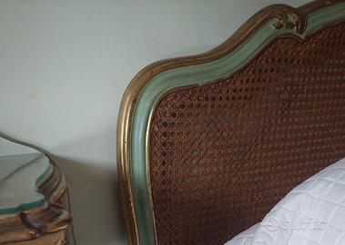 Semplice ed elegante letto matrimoniale giroletto Luigi XV decorato sui toni del verde e oro in paglia di Vienna