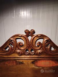 Il pezzo si distingue per la ricca cimasa superiore interamente intagliata a mano, con motivi ornamentali a volute, riccioli e foglie d'acanto che donano movimento e importanza alla struttura. La finitura presenta una calda tonalità naturale con eleganti accenti dorati che ne sottolineano le forme.