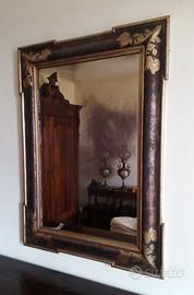 Antica testata imbottita per letto matrimoniale + specchio coordinato, entrambi argentati in foglia.