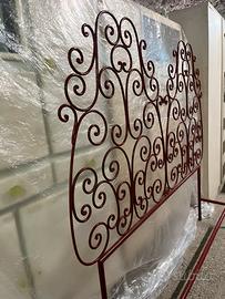 Testata mattimoniale in ferro battuto con ricci dipinta di rosso Testata autoportante grazie al basamento misure144x24x24h Larghezza massima parte con ricci 168 cm Altezza massima 156 cm