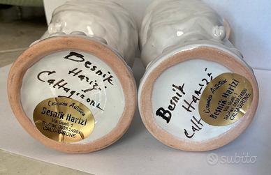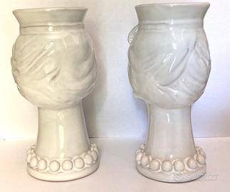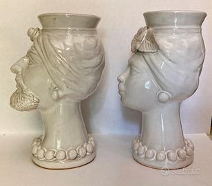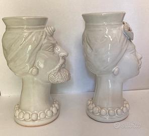 Tradizionali teste di Moro siciliane, realizzate a mano da un artista della ceramica di Caltagirone (Besnik Harizi, lo trovate in rete e potete vedere la sua carriera ed i prezzi originali originali delle sue opere), firmati a mano sul retro, colore bianco perlato.