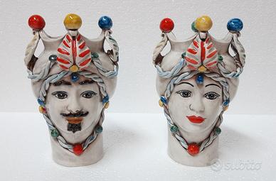 Vendesi coppia teste di moro in ceramica di Caltagirone realizzate e decorate interamente a mano.