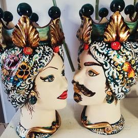 Coppia teste di moro in ceramica di Caltagirone modellate a mano e dipinte a mano con preziosi decori barocchi con gruppi di fiori e frutta altezza 45 cm, con applicazione a mano di foglia oro .