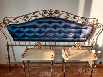Testiera per letto matrimoniale in ottone con rivestimento in tessuto blu capitonné. Disponibili anche comodini abbinabili euro 50 cadauno