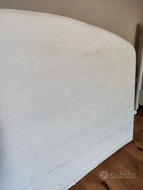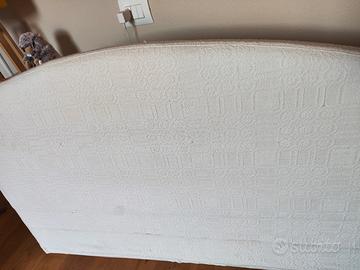 testiera imbottita per letto piazza e mezza rivestito con tessuto antico bianco ricamo in rilievo. il cordolo che si vede verso la base è il cordino della cucitura che con il materasso davanti non so vede più. lo si può appoggiare al muro oppure fissare con ganci.