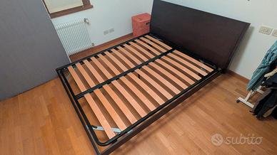 Vendo testiera già smontata in legno massello colore marrone scuro, i piedini sono solidali a 4 squadre che si stringono ai 4 angoli e su cui poggierà la rete. Rete a doghe non inclusa, ma disponibile con annuncio esterno.