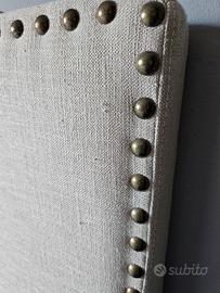 testiera letto matrimoniale imbottita, rivestimento in lino color corda con borchie.