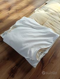 testiera per letto matrimoniale con palo in bambù. il cuscino è dotato di un copri cuscino fatto su misura dal tappezziere che può essere anche tinto di un altro colore e di conseguenza si può sfoderare per lavare meglio. completo di gangi per appenderlo al muro.
