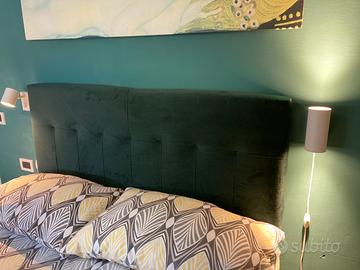 Testiera letto imbottita in velluto verde bosco. Si può appendere o appoggiare a terra con i piedi in dotazione. Acquistata ma sostituta dopo poco per cambio letto, quindi come nuova. Misure 141x63. Adatta per matrimoniale alla francese e letto una piazza e 1/2.