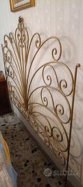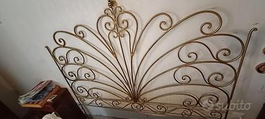 Testiera per letto matrimoniale in ferro pieno con finitura dorata, caratterizzata da un elaborato design a volute e riccioli decorativi,
