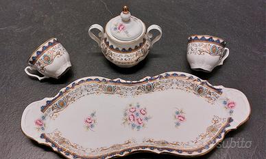 Bellissimo tete a tete, in porcellana, t. Limoges, nuovo, senza confezione, solo esposto in vetrinetta. Composto da 2 tazzine da caffè, zuccheriera con coperchio e vassoio, finemente decorati nei toni del blu e oro.