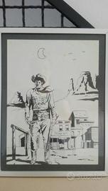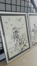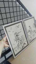 China nera su foglio bianco in cornice vetro e legno/metallo (legno rivestito di metallo argentato). Anni 70.