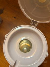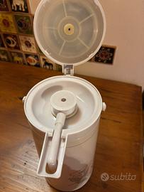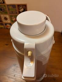 Thermos con manico per il trasporto. Ottimo per gite, pic nic o in casa. Dispensa bevanda premendo un pulsante. Rovinato in 2 piccoli punti come da foto, in esterno