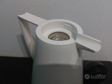 Caraffa termica originale Guzzini modello “Bon Ton”, disegnata da Furio Minuti nel 1988. Iconico esempio di design italiano anni ’80, molto apprezzato da collezionisti e amanti dell’arredo vintage. Realizzata con corpo in materiale plastico e ampolla interna in vetro, mantiene a lungo la temperatura di tè, caffè o altre bevande. Il tappo a cupola con sistema di versamento automatico è perfettamente funzionante.