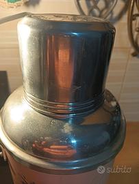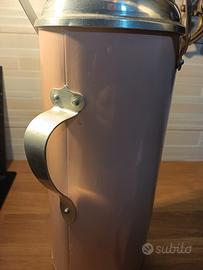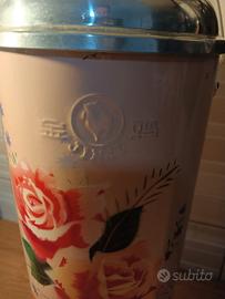 Termos Vintage Cinese JINLIPAI – Design Iconico Anni '70/'80 – Rosa con Rose – 38 cm Descrizione dell'Oggetto: In asta un autentico pezzo di storia del design orientale: un termos vintage originale a marchio JINLIPAI (金利牌), prodotto in Cina tra gli anni '70 e '80. Questo modello è un classico esempio di "Modernariato Cinese", caratterizzato dal tipico corpo in metallo verniciato in una delicata tonalità rosa pastello, decorato con vivaci grafiche floreali (rose e peonie) che simboleggiano prosperità. Dettagli Tecnici: Marca: JINLIPAI (Logo originale impresso sul tappo in alluminio). Altezza: 38 cm (Formato grande da circa 2 litri). Materiali: Struttura esterna in metallo, tappo/tazza in alluminio, maniglia ergonomica per il trasporto. Stile: Shabby Chic / Industrial Vintage / Chinoiserie. Stato di Conservazione: L'oggetto si presenta in ottime condizioni estetiche vintage. La vernice è lucida e le decorazioni floreali sono ben conservate, con minimi segni del tempo che ne attestano l'originalità e ne aumentano il fascino (piccole fioriture superficiali o lievi graffi come da foto). Nota: Ideale come complemento d'arredo, vaso per fiori "dry" o pezzo da collezione.