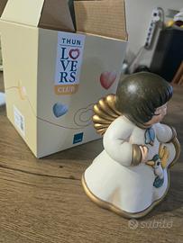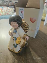 Angelo Thun 2024 della collezione Love is. - Realizzato in ceramica. - Dettagli color oro e azzurro. - Raffigura un angelo con un colibrì.