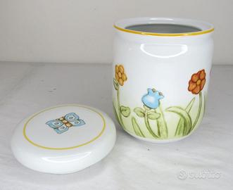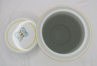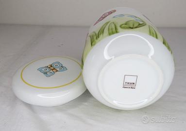 Marca: THUN Tipologia: Barattolo / contenitore da cucina Materiale: Porcellana sotto smalto Utilizzo: Zucchero, caffè, spezie, piccoli alimenti Misure (stimate coerenti con linea) Diametro: circa 9–10 cm Altezza: circa 12–14 cm Capacità (portata) Capienza: circa 300 – 500 ml Peso: circa 400 grammi Un oggetto semplice che diventa protagonista della cucina. Il barattolo piccolo della linea Claire firmato THUN unisce estetica e funzionalità, portando sulla tavola uno stile delicato e riconoscibile. Le decorazioni con farfalle, foglie e piccoli dettagli naturali raccontano un’idea di casa calda e accogliente, perfetta per ogni giorno. Pensato per conservare alimenti come zucchero, caffè o spezie, questo barattolo è dotato di pratica chiusura ermetica che aiuta a mantenere la freschezza. È ideale anche come elemento decorativo o come regalo raffinato, soprattutto se abbinato agli altri articoli della stessa collezione.