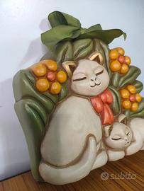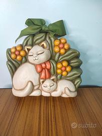 Graziosa formella in ceramica smaltata di Thun, raffigurante due teneri gatti bianchi accoccolati tra vivaci fiori arancioni e gialli su un letto di foglie verdi. Il gatto più grande indossa un elegante fiocco rosso al collo, mentre un allegro fiocco verde decora la parte superiore della composizione.