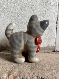 Thun, gatto Lexy grigio, con fiocco rosso vintage, fuori produzione in perfette condizioni. Altezza di circa 10 cm, base 6 cm.