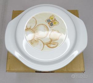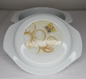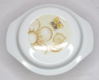 Design: decorazione con tulipani, girasoli e farfalle; colori neutri che permettono anche la presentazione diretta in tavola.