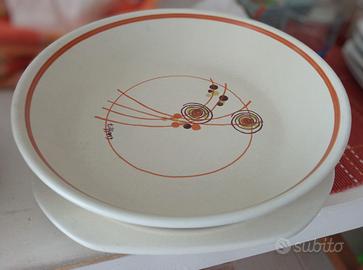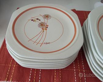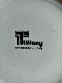 Bellissimo servizio Tiffany made in Italy, in ceramica sabbiata, dipinto a mano. Vintage anni 60/70. Forma squadrata per i 6 piatti piani e 6 piatti da frutta, tonda per i 6 piatti fondi e la grande insalatiera con sottopiatto.