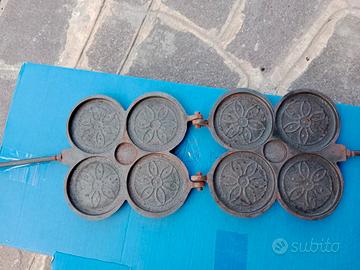 Bellissima tigelliera in ghisa,molto pesante,con manici rifiniti in legno,tenuta molto bene,cuoce benissimo,bella anche come pezzo D'antiquariato .
