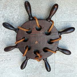 Prezzo trattabile. Timone di nave vintage, elemento d'arredo da parete con gancio per appenderlo. In legno massello scuro intagliato con maniglie e una corda rustica avvolta intorno al bordo, include un termometro al centro a quadrante giallo rotondo. Epoca anni '70-'90. Condizioni ottime con normali segni del tempo.