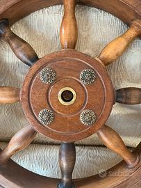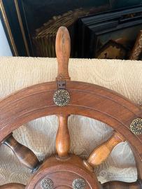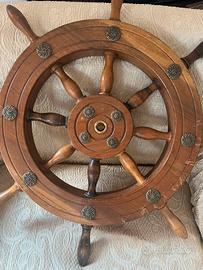 Timone nautico decorativo in voga negli anni 70. Struttura tipica con raggi e impugnature , foro centrale dove si collegava al meccanismo di governo. Decorato con placche in motivo floreale. Diametro 65 cm da una maniglia all’altra , peso 5 kg . Presenta leggeri segni del tempo.