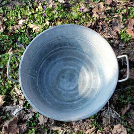 Tinozza in zinco circolare con due manici laterali. DIMENSIONI: Diametro 45 cm Altezza 23 cm Utilizzabile come fioriera da esterno, contenitore per legna o come elemento d'arredo d'interni.