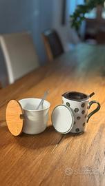 Tazze per the e tisana, con coperchio, una con filtro e una con cucchiaino. Nuove mai usate. Il coperchio serve per mantenere la fragranza.