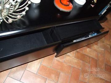 Causa trasloco propongo in vendita elegante mobile soggiorno libreria porta tv marca TISETTANTA. E' un mobile costruito senza risparmio, niente a che vedere con quelli proposti dai mercatoni. Tutto è in legno massello, non c'è nulla in tamburato. I montanti laterali sono spessi 5,5 cm, le schiene 2,5 cm ( si può tranquillamente appenderci un tv a schermo piatto), i ripiani in cristallo temperato sono spessi 0,8mm e non si flettono nemmeno sotto il peso di una enciclopedia. Sono presenti due ante scorrevoli: una in ciliegio massello che può occultare uno dei due vani grandi alti e una vetrata che protegge la colonna di sinistra (si vede in una sola foto). Entrambe sono amovibili senza pregiudicare l'estetica del mobile. Nei due vani laterali sono posizionati in alto due faretti ad incasso per illuminare gli oggetti contenuti. In basso sono presenti due grandi cassetti molto profondi. Il cassetto di destra cela un cassetto "segreto" molto sottile. Le dimensioni sono: 269 x 65 x 220 (lxpxh). Le condizioni sono pari al nuovo. Per qualsiasi info sono a disposizione.