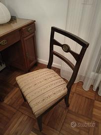 Vendesi elegante toeletta da camera originale di fine '800 / primi '900 in legno pregiato. Il mobile, dal design classico e intramontabile, è perfetto per arredare camere da letto, cabine armadio o bagni di prestigio. Specchiera grande ovale basculante con supporti sagomati. Inclusa sedia coordinata con seduta imbottita in tessuto damascato. Ottimo stato conservativo, legno lucido e struttura solida. Prezzo: € 550 (Trattabili) Ritiro a mano a carico dell'acquirente.