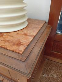 *Toeletta Liberty inizio '900 in vendita* - Legno intagliato, marmo rosso, vetro satinato buccellato di colore ambra. - Specchio centrale, 2 colonnine con 4 cassetti ciascuna. - Piccoli segni di usura. - Prezzo: € 350 trattabili