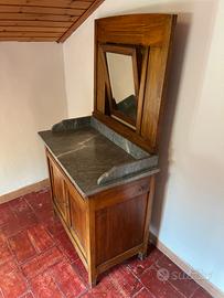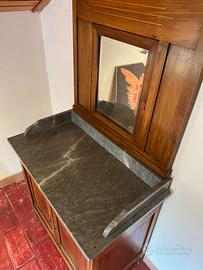Mobile toeletta da camera con specchio basculante. Cassetto centrale e 2 ante. Piano in marmo nero. Restaurato. Stile rustico di inizio ‘900. Misure: 86 cm di larghezza x 158 cm di altezza x 48 cm di profondità.