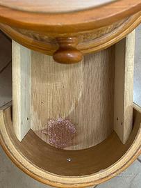 Elegante toeletta in vimini con specchio orientabile e sedia coordinata. Una cassettiera e tre cassetti laterali (il cassetto laterale nel mezzo presenta una macchia) mentre l'ultimo è molto capiente. La superficie della toeletta è protetta da una lastra di vetro.