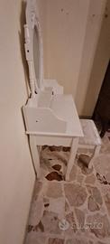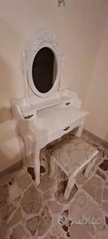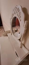 Realizzata in legno, 3 cassetti con maniglie bronzate, specchio ovale e sgabello. Presenta qualche segno di utilizzo, lo sgabello è stato ripreso con aggiunta di serramenti.