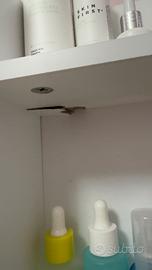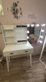 Vendo bellissima postazione toeletta da trucco color bianco, perfetta per tenere in ordine skincare e make-up. Il mobile è in ottime condizioni e molto funzionale. Caratteristiche principali: • Specchio incluso: Ampio specchio centrale. • Illuminazione: Sistema di luci LED stile Hollywood (luce chiara, perfetta per il trucco). • Spazio contenitivo: 2 ampi cassetti con maniglie nere moderne e 3 ripiani laterali a vista per esporre profumi e creme. • Sgabello incluso: Seduta imbottita in tessuto beige/ sabbia, molto comoda e coordinata. • Design: Linee pulite ed eleganti, si adatta a ogni camera da letto o cabina armadio. Dimensioni: 40P x 80L x 140 H Nota sulle condizioni: Come si vede nell'ultima foto, il mobile è in ottime condizioni generali. Segnalo solamente un piccolo difetto estetico/segno scuro sotto uno dei ripiani laterali, vicino a una vite di fissaggio. E un dettaglio poco visibile una volta che ci sono i prodotti sopra, ma ci tengo a farlo presente per massima correttezza. Il ripiano è perfettamente stabile e solido. Disponibile per il ritiro a mano a Maenza (LT)