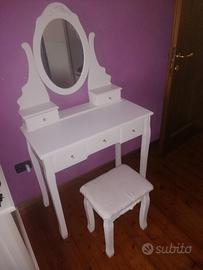 Tavolino per trucco con specchio ovale, bianco, 5 cassettini e sgabello largo 80 cm, profondità 40 cm, altezza 75 cm.