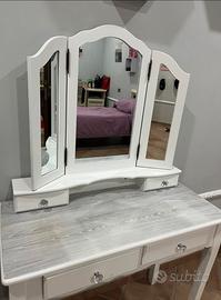 toeletta trucco bianca e grigia con maniglie in cristalli. larghezza 90 cm lunghezza 144cm