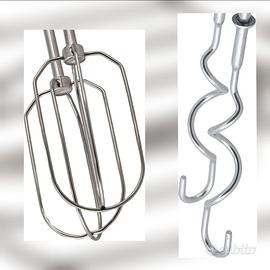 ACCESSORI: 2 ganci in acciaio inossidabile per poter impastare e amalgamare composti più resistenti come pane e pizza; 2 fruste in acciaio inossidabile per mescolare composti piu' spumosi e leggeri, come pan di spagna, panna montata o meringa