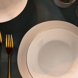 Servizio da 36 pezzi Tognana linea delphi filo d'oro, 12 piatti piani, 12 piatti fondi, 12 piatti dolci. Immacolati, nuovi ancora nell'imballo originale. Vendibili anche in parti da 18 pezzi ciascuna. Serena