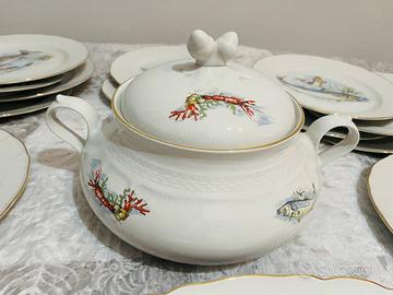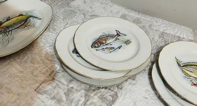 Vendo Servizio da Pesce Vintage in Porcellana con decorazioni di pesci e bordo dorato.